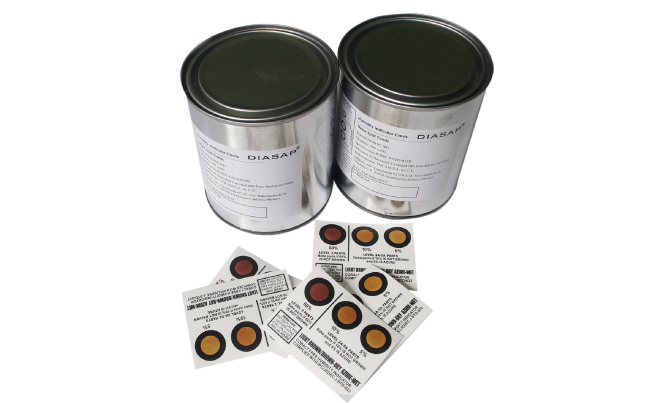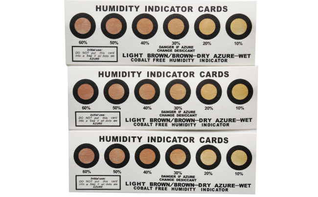 濕度指示卡主要用于半導體、線路板(PCB)、軍需品、光學儀器、醫藥、倉儲及其他包裝等。成品為可視卡片,卡片中每個圓點分別對應一個濕度值,隨著相對濕度的變化,圓點通常由藍色逐漸變成粉紅色(含鈷濕度卡),或者由棕色變成淺藍色(無鈷濕度卡),由此可以確定環境的相對濕度值,以幫確定干燥劑是否需要更換,濕度卡可根據客戶需求定制。可與鋁箔袋,干燥劑等配套使用。